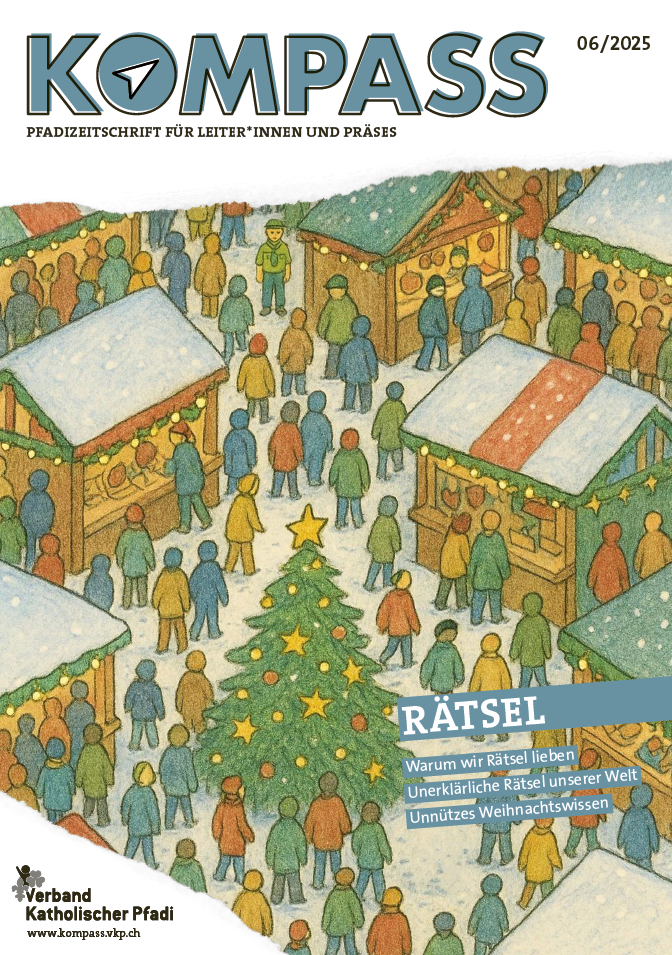 Rätsel tauchen überall in unserem Alltag auf: Im Kreuzworträtsel am Küchentisch, in einer kniffligen Escape-Room-Aufgabe, in mysteriösen Geschichten – oder wenn das Leben selbst Fragen stellt, auf die es nicht sofort Antworten gibt. In dieser Ausgabe laden wir dich ein, genau diesem Rätselcharakter nachzuspüren. Los geht es schon auf dem Titelbild: Im Wimmelbild hat sich irgendwo ein Pfadi versteckt. Ein erster kleiner Test für deinen Spürsinn, bevor du im Heft tiefer ins Thema eintauchst. Auf den folgenden Seiten findest du verschiedene Rätsel, die sich durchs ganze Heft ziehen. Wenn du sie löst, erhältst du Buchstaben, die zusammen ein Lösungswort ergeben. Mit etwas Glück gewinnst du einen Preis.